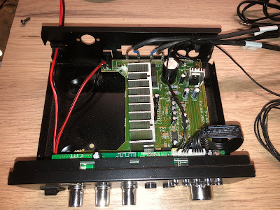 The amplifier was stripped down and modified to be able to mount shallower in the wall without cables plugged into the rear of it. The 230v transformer was removed and the power switch on the front wired to the 12v supply instead. The 12v in, audio line in, and speaker output connections were all removed and hard wired to the main circuit board allowing the wiring to exit out the side of the unit.